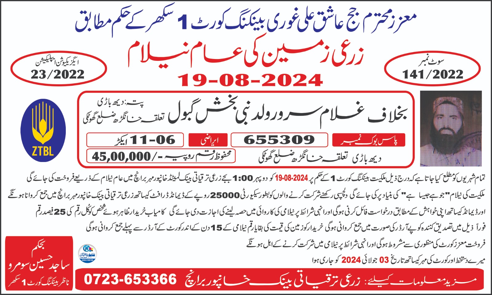45. ZTBL  ہارون آباد برانچ بمقابلہ محمد عباس عابد ولد علی محمد، پھانسی نمبر 149/2023 [30-جنوری-2025، جمعرات 12.00 بجے]