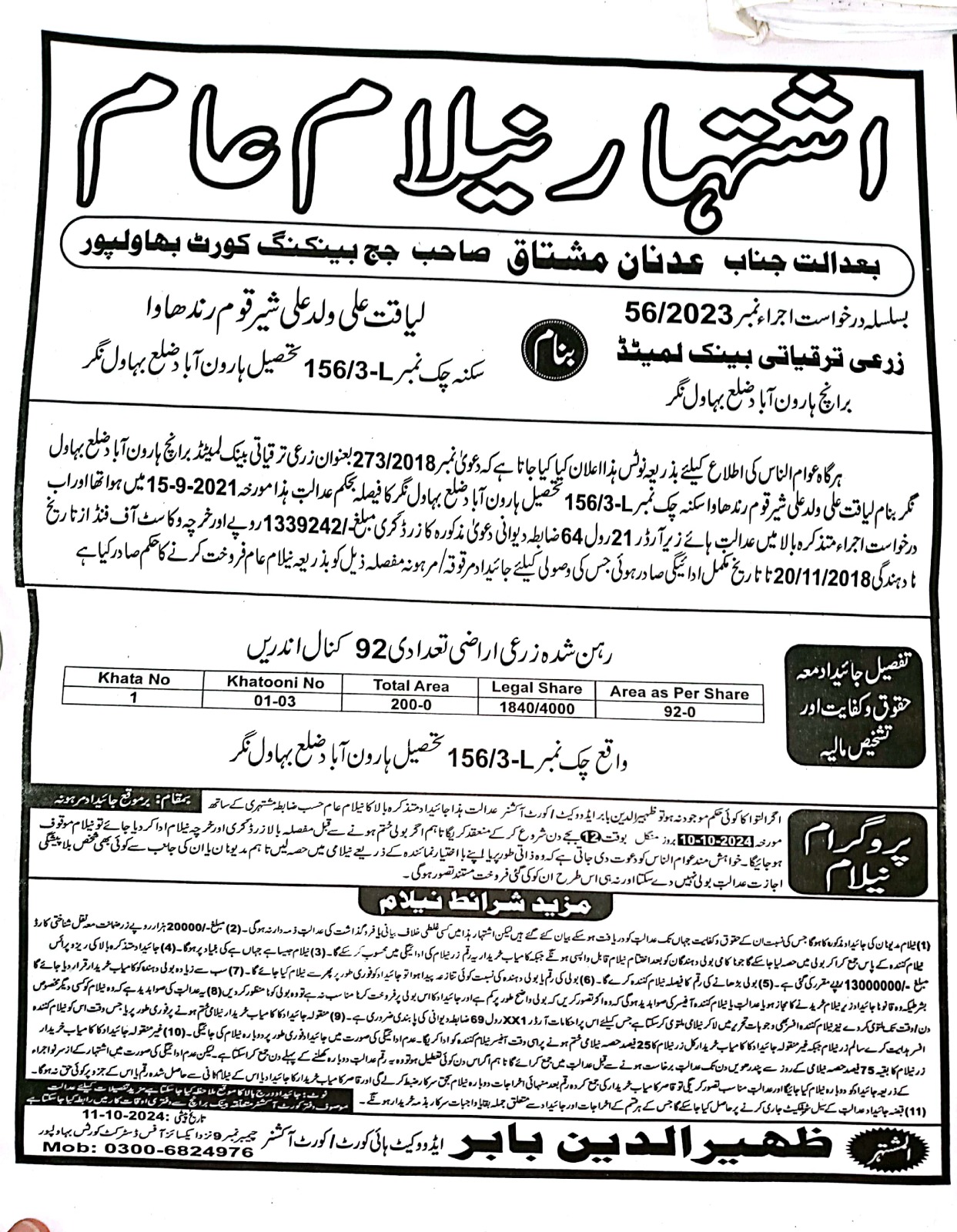 78. ZTBL ہارون آباد برانچ بمقابلہ لیاقت علی ولد علی شیر، پھانسی نمبر 56/2023 [10-اکتوبر-2024، منگل 12.00 بجے]