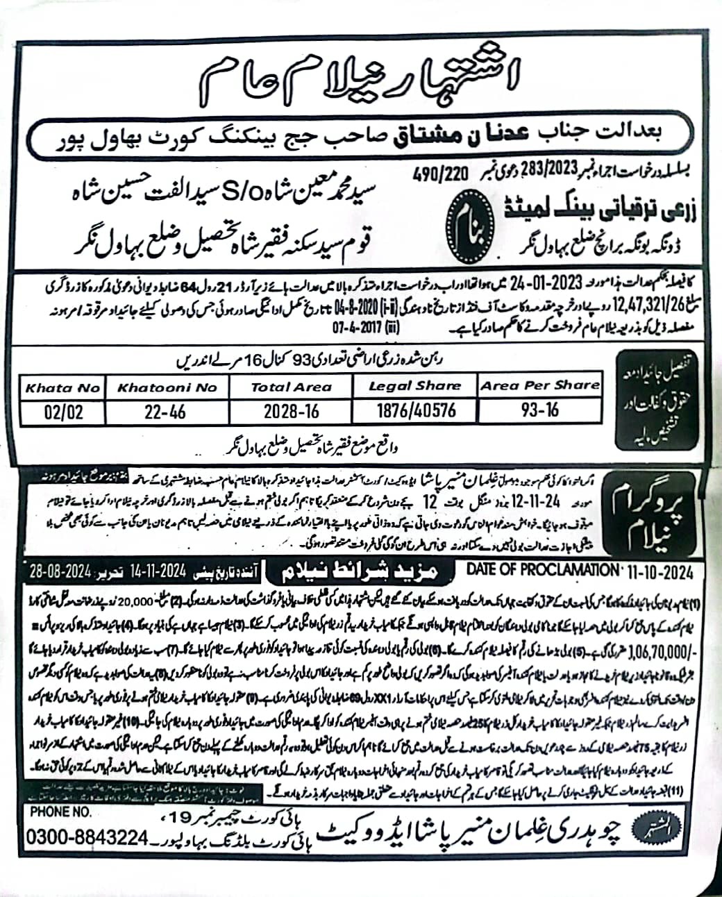 76. ZTBL ڈونگا بونگا برانچ بمقابلہ سید محمد معین شاہ ولد سید الفت حسین شاہ، پھانسی نمبر 283/2023 [12-نومبر-2024، منگل 12.00 بجے]