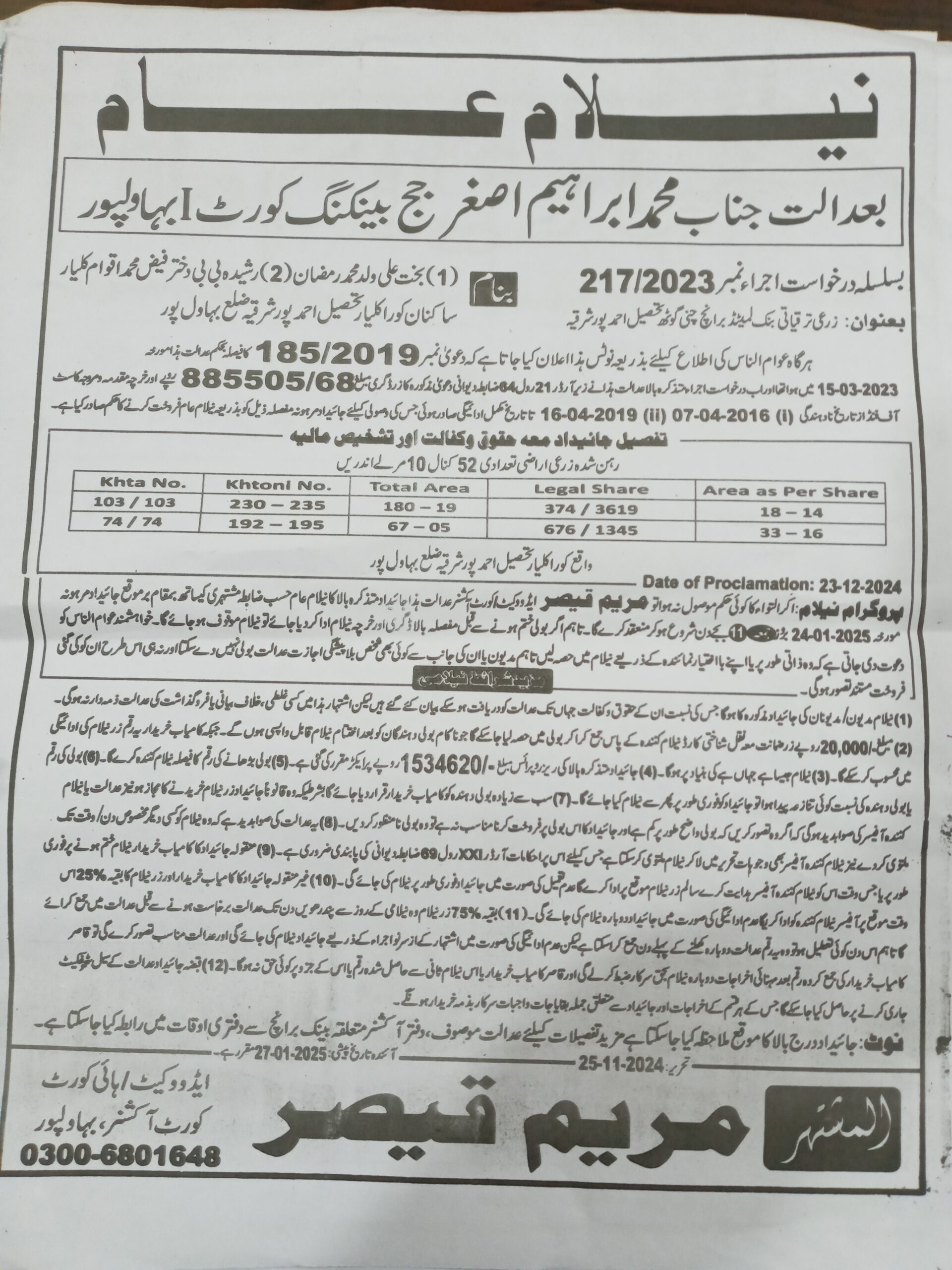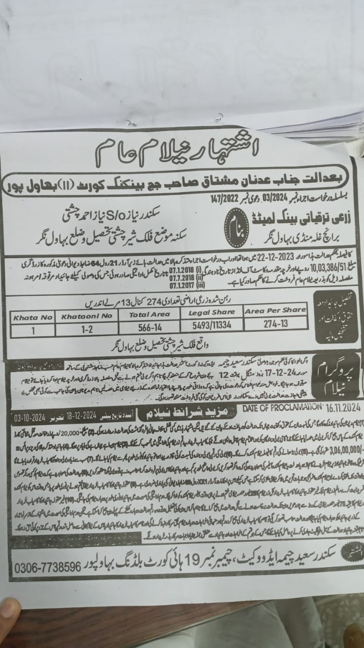 131. نیلامی-ماروٹ برانچ-بہاولنگر ریجن-ZTBL بمقابلہ محترمہ شمیم ​​اختر W/O میاں اللہ یار مموکا [27مئی2024]