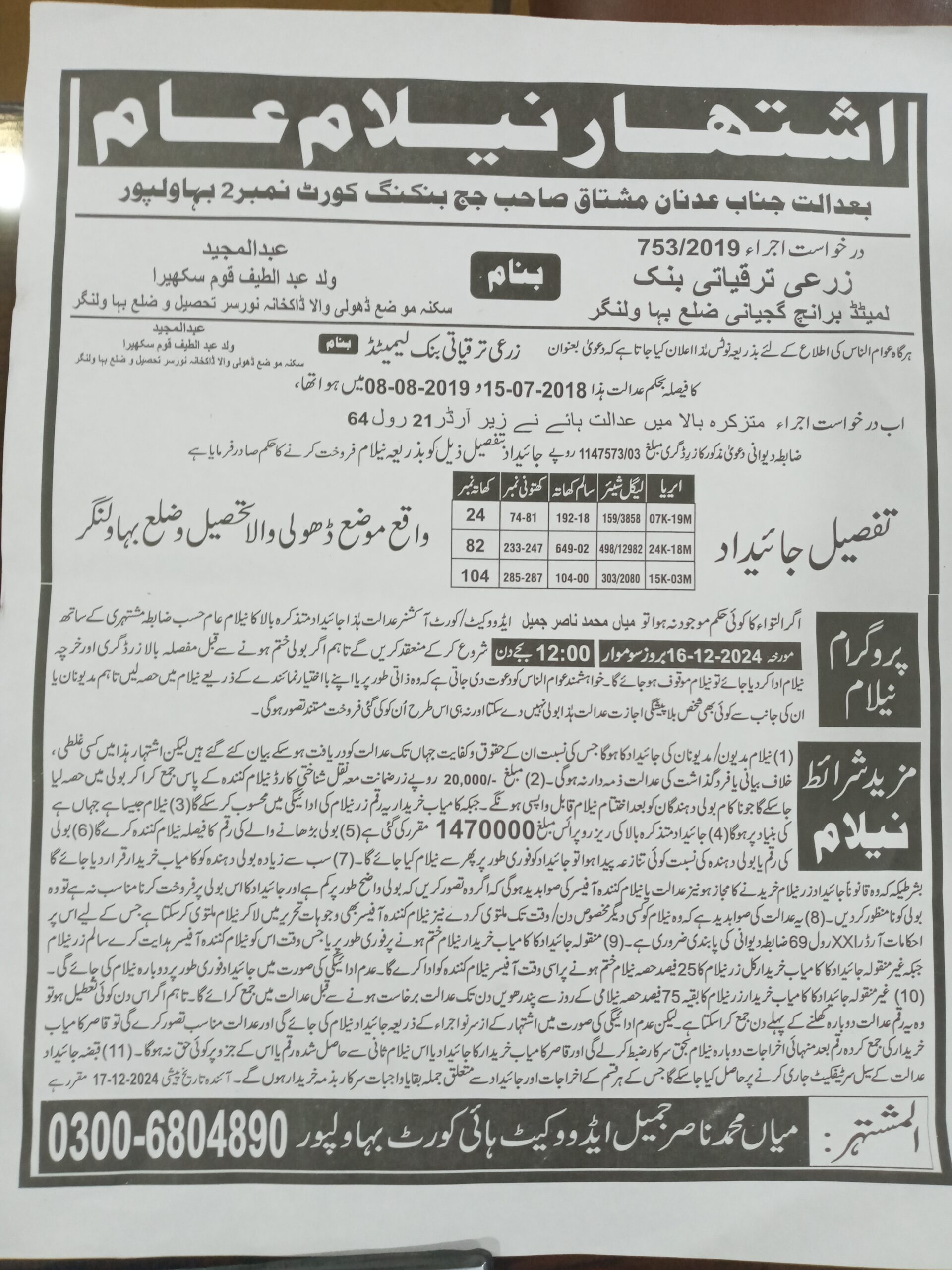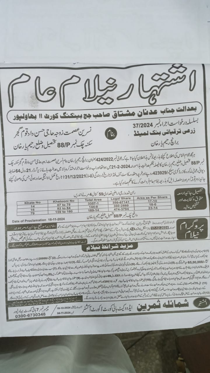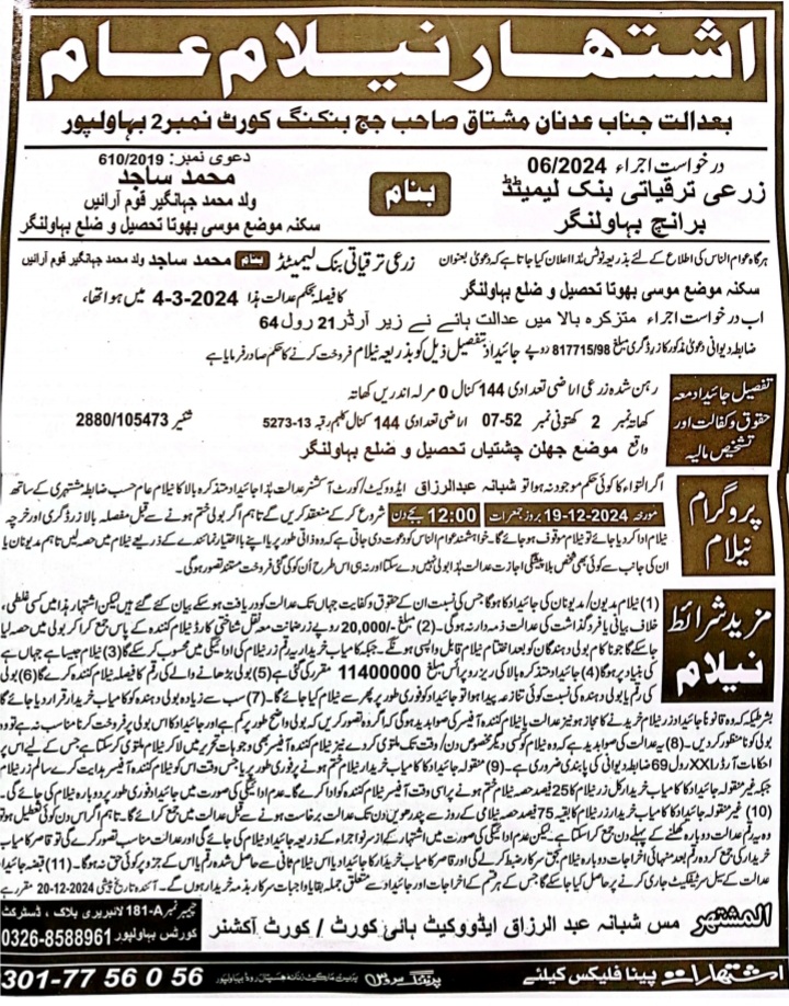 52. ZTBL بہاولنگر برانچ بمقابلہ محمد ساجد ولد محمد جہانگیر، پھانسی نمبر 06/2024 [19-دسمبر-2024، جمعرات 12.00 بجے]