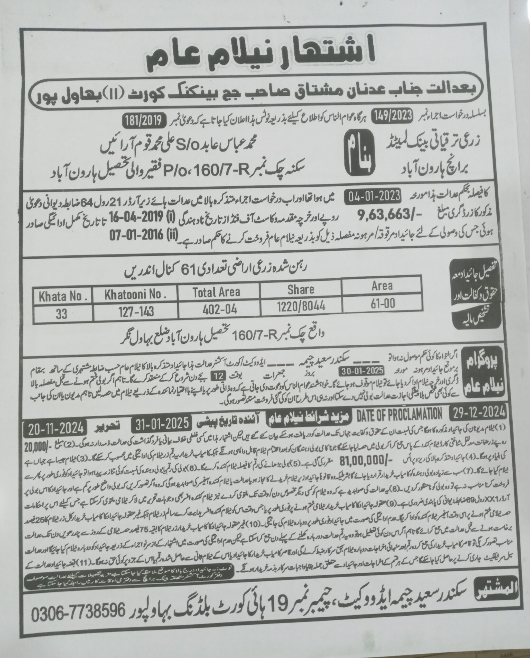 147. ZTBL ڈونگا بونگا برانچ بمقابلہ محمد جہانگیر ولد محمد خان، پھانسی نمبر 109/2023 [31-جنوری-2024، جمعہ صبح 11.00 بجے]