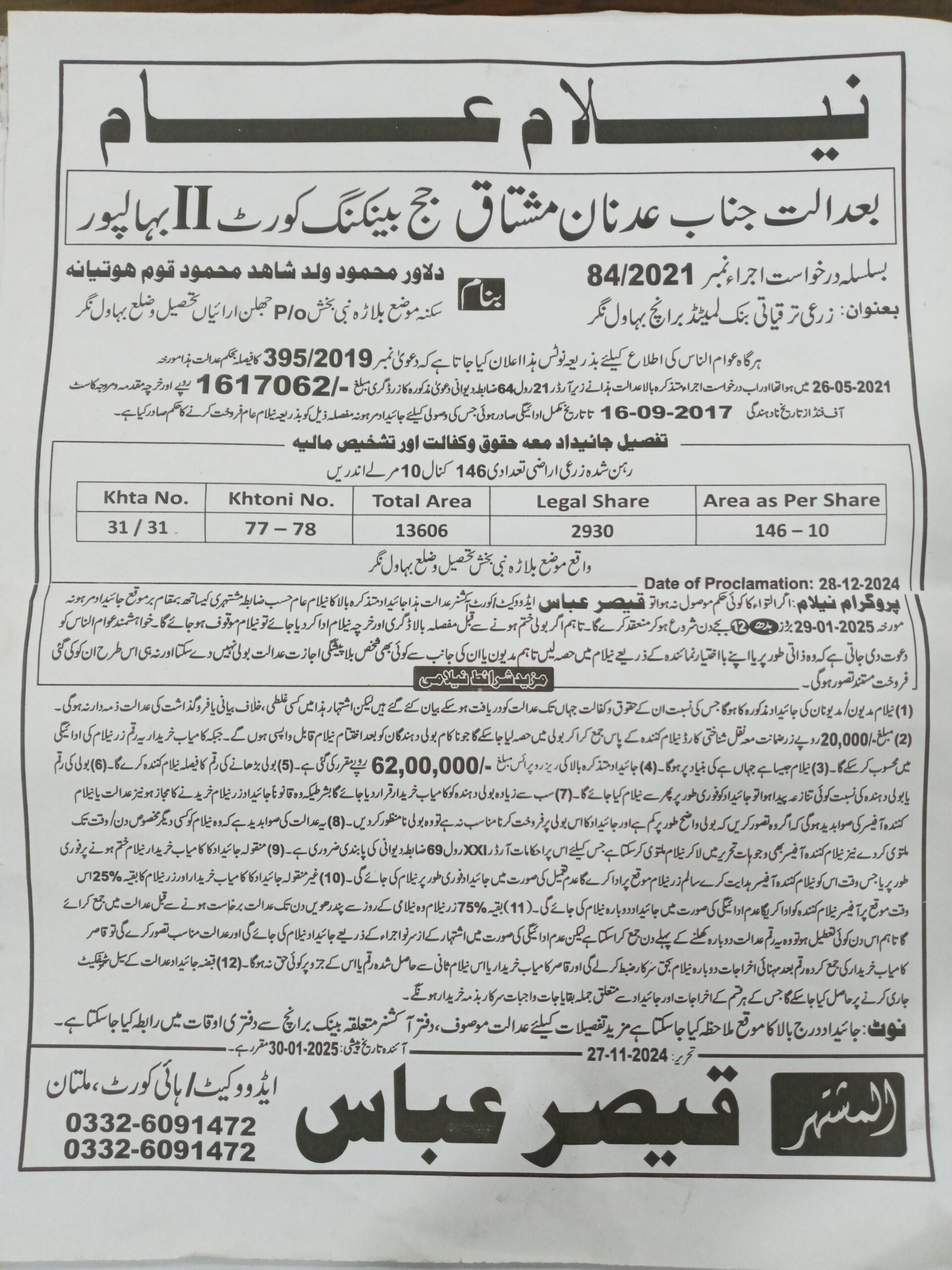 41. ZTBL بہاولنگر برانچ بمقابلہ دلاور محمود S/O شاہد محمود، پھانسی نمبر 84/2021 [29-جنوری-2025، بدھ 12.00 PM]