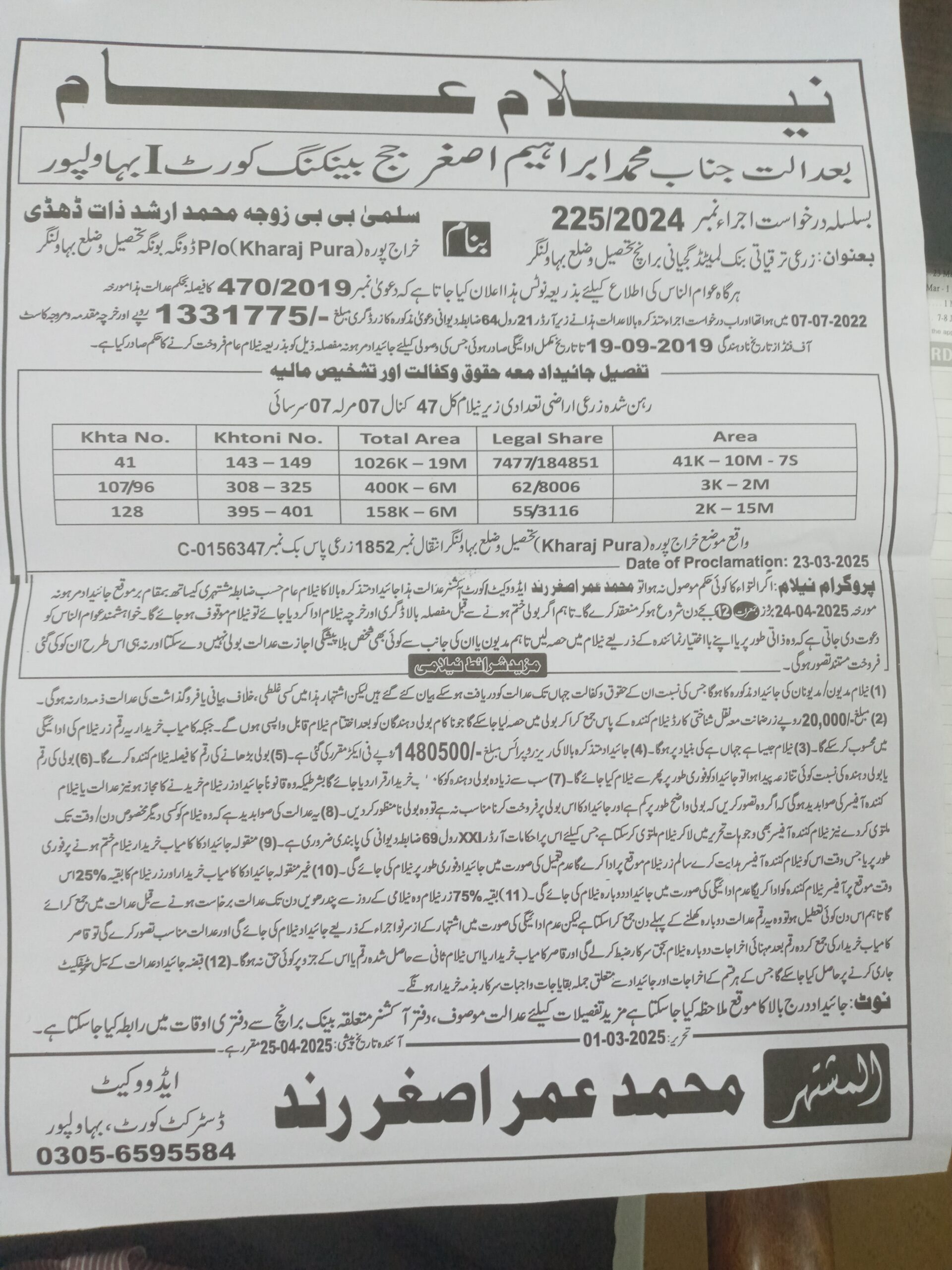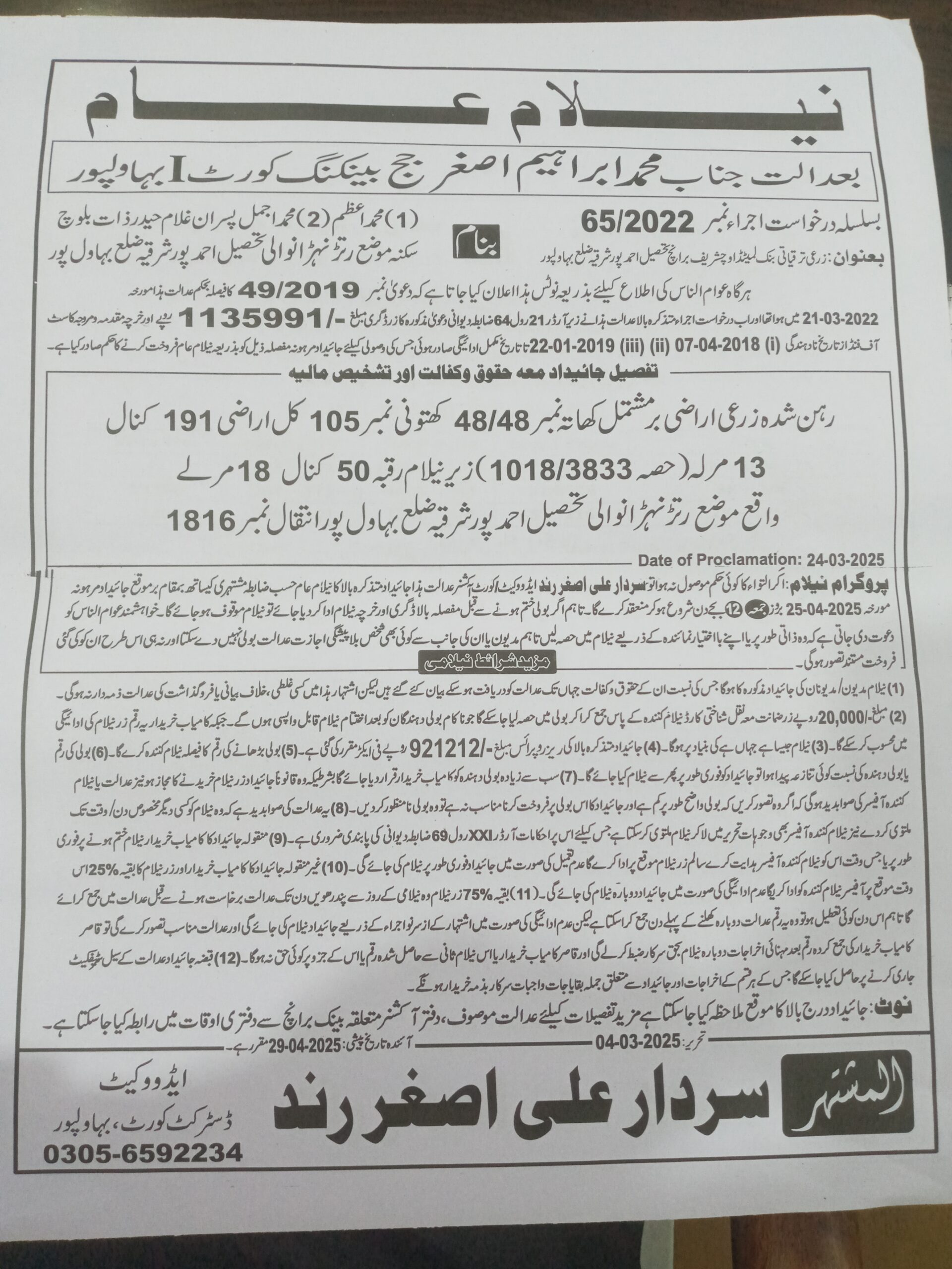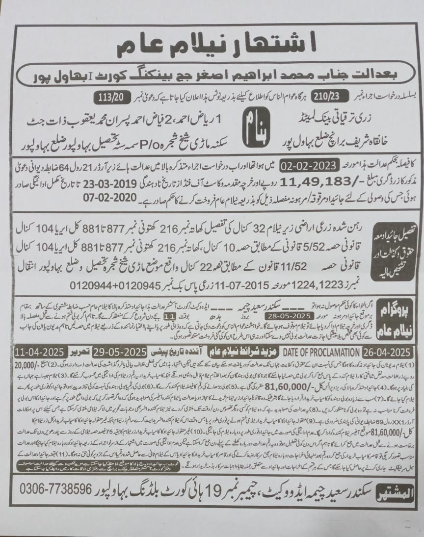 32. ZTBL یوسی ایچ شریف برانچ بمقابلہ محمد اعظم/محمد اجمل ولد غلام حیدر، پھانسی نمبر 65/2022 [25-اپریل-2025، جمعہ 12.00 بجے]