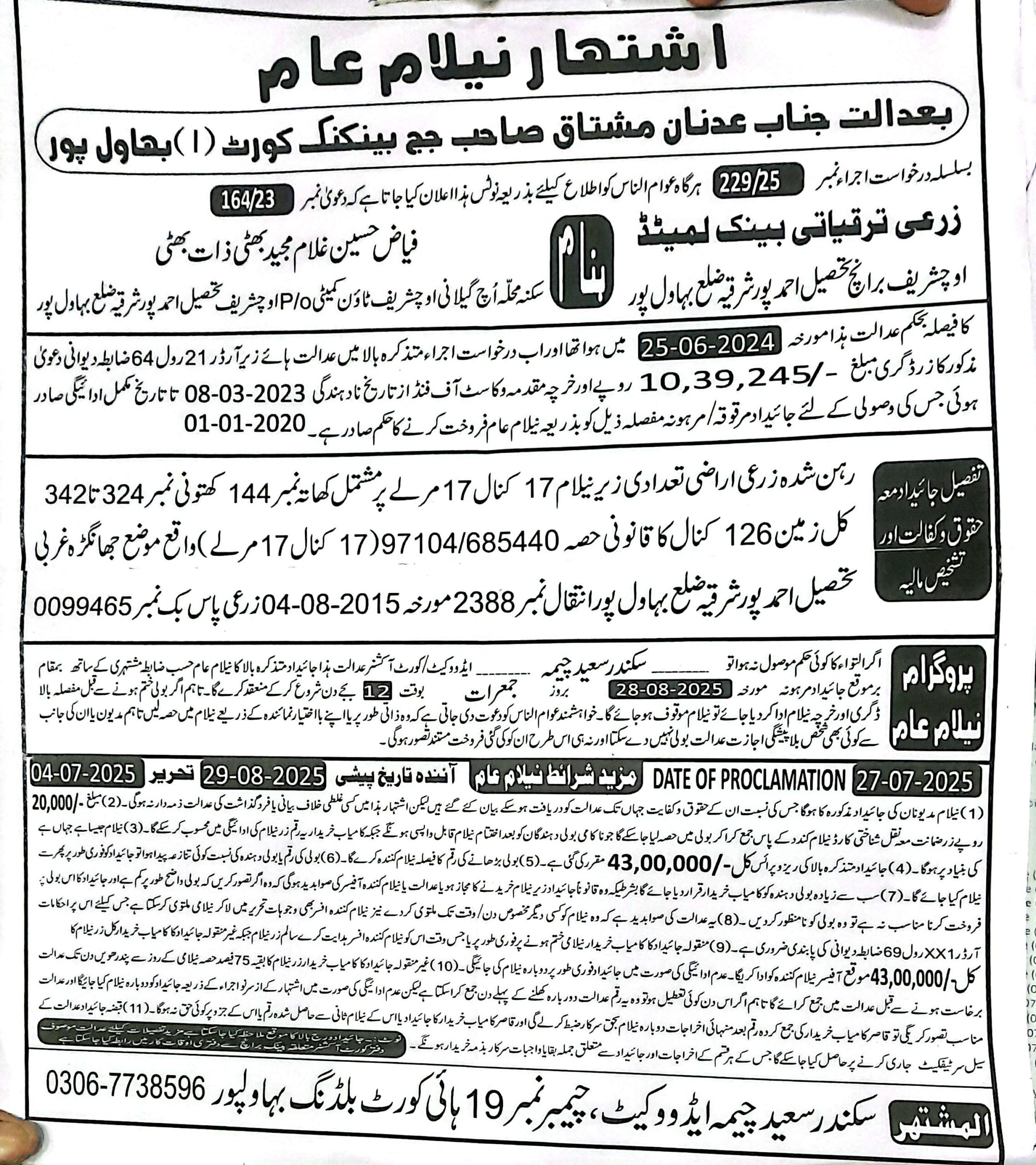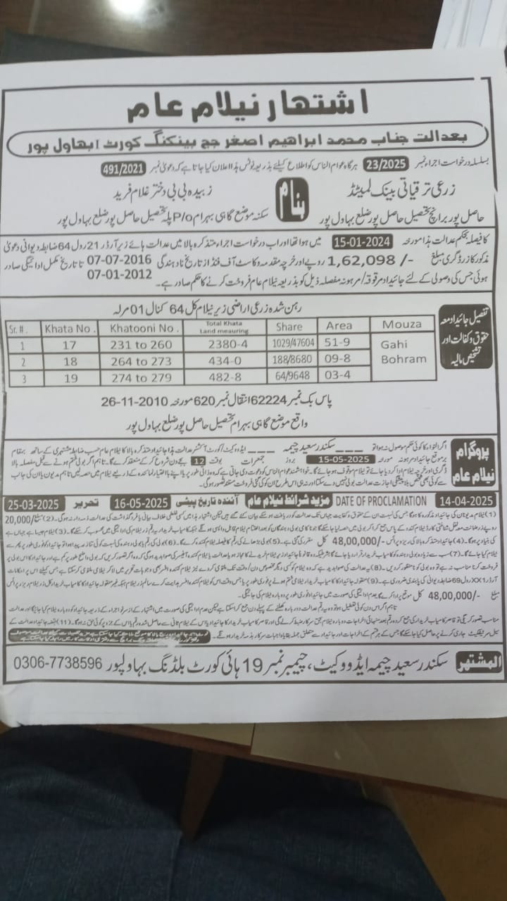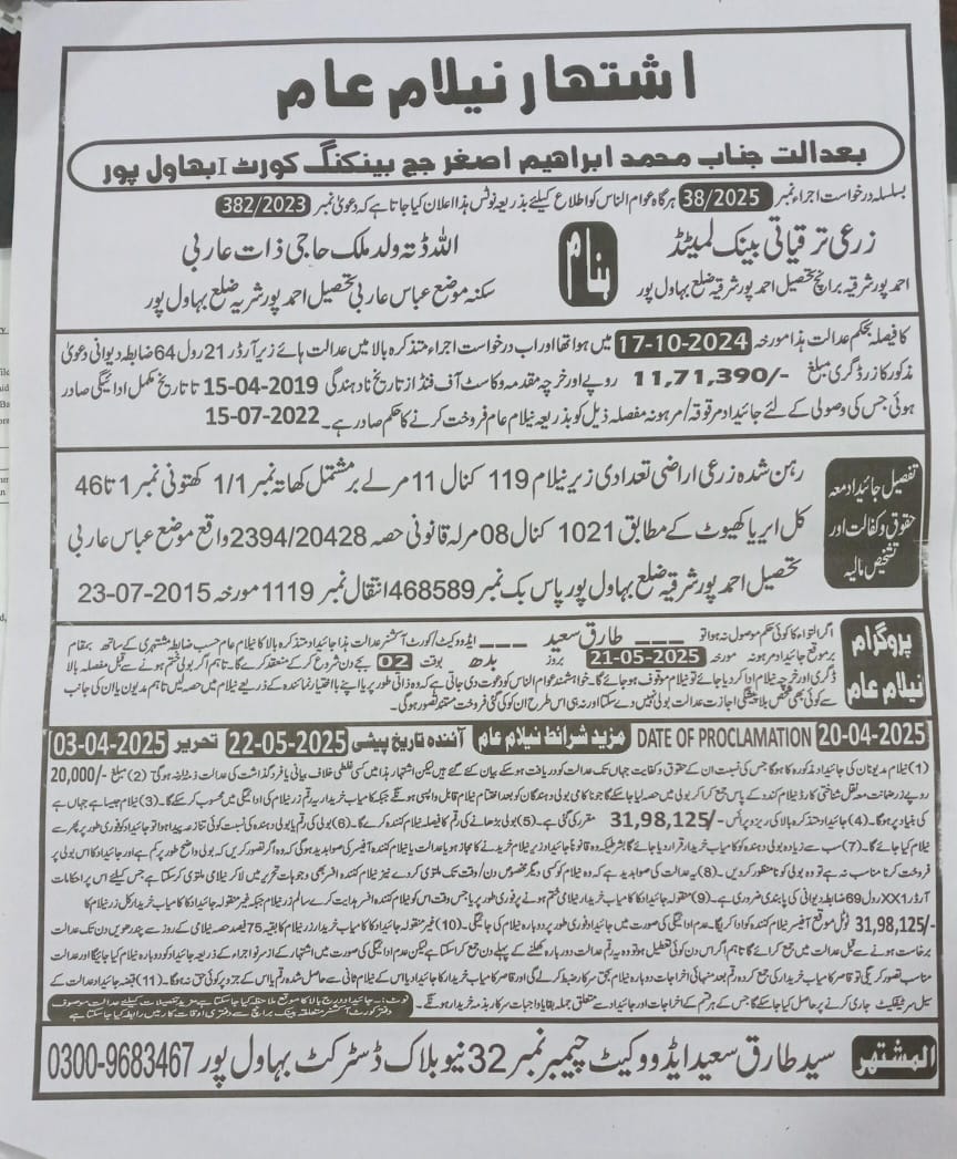 25. ZTBL احمد پور ایسٹ برانچ بمقابلہ اللہ دتہ ولد ملک حاجی، پھانسی نمبر۔ 38/2025 [21-مئی-2025, بدھ AT 02.00 PM]