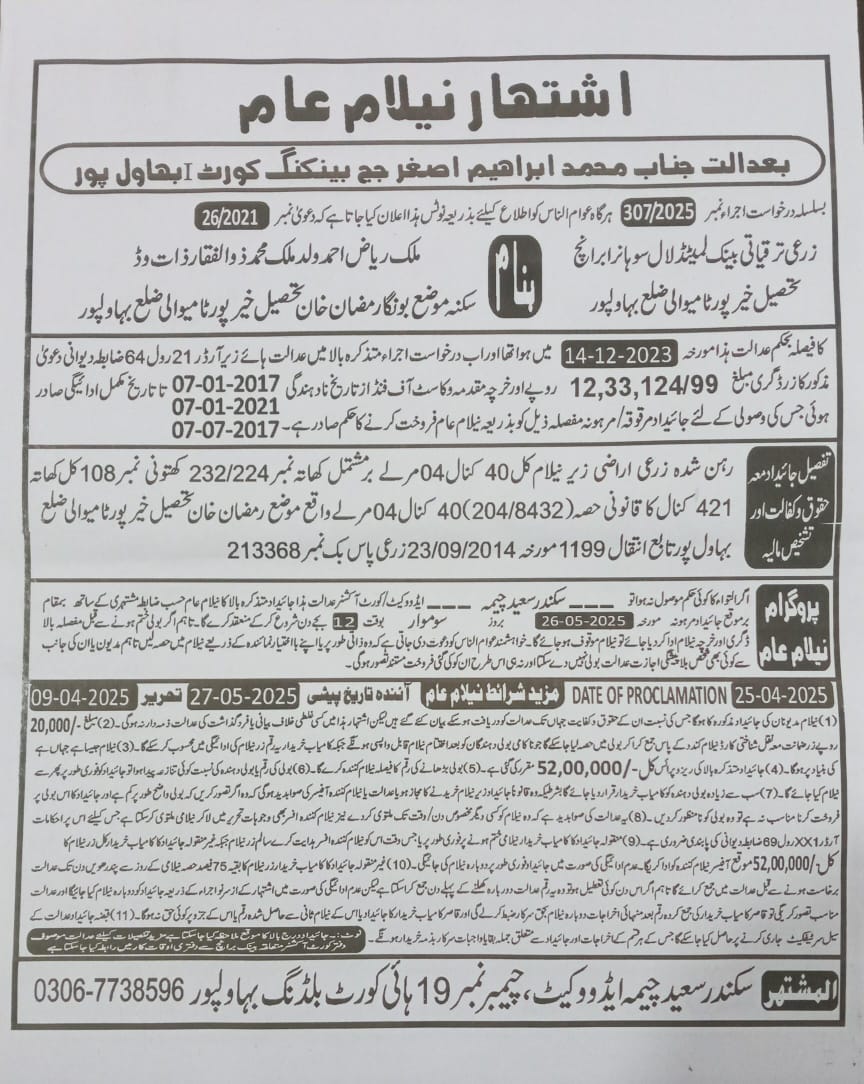 23. ZTBL لال سوہانرا برانچ بمقابلہ ملک ریاض احمد ولد ملک ذوالفقار، پھانسی نمبر 307/2025 [26-مئی-2025، پیر 12.00 بجے]