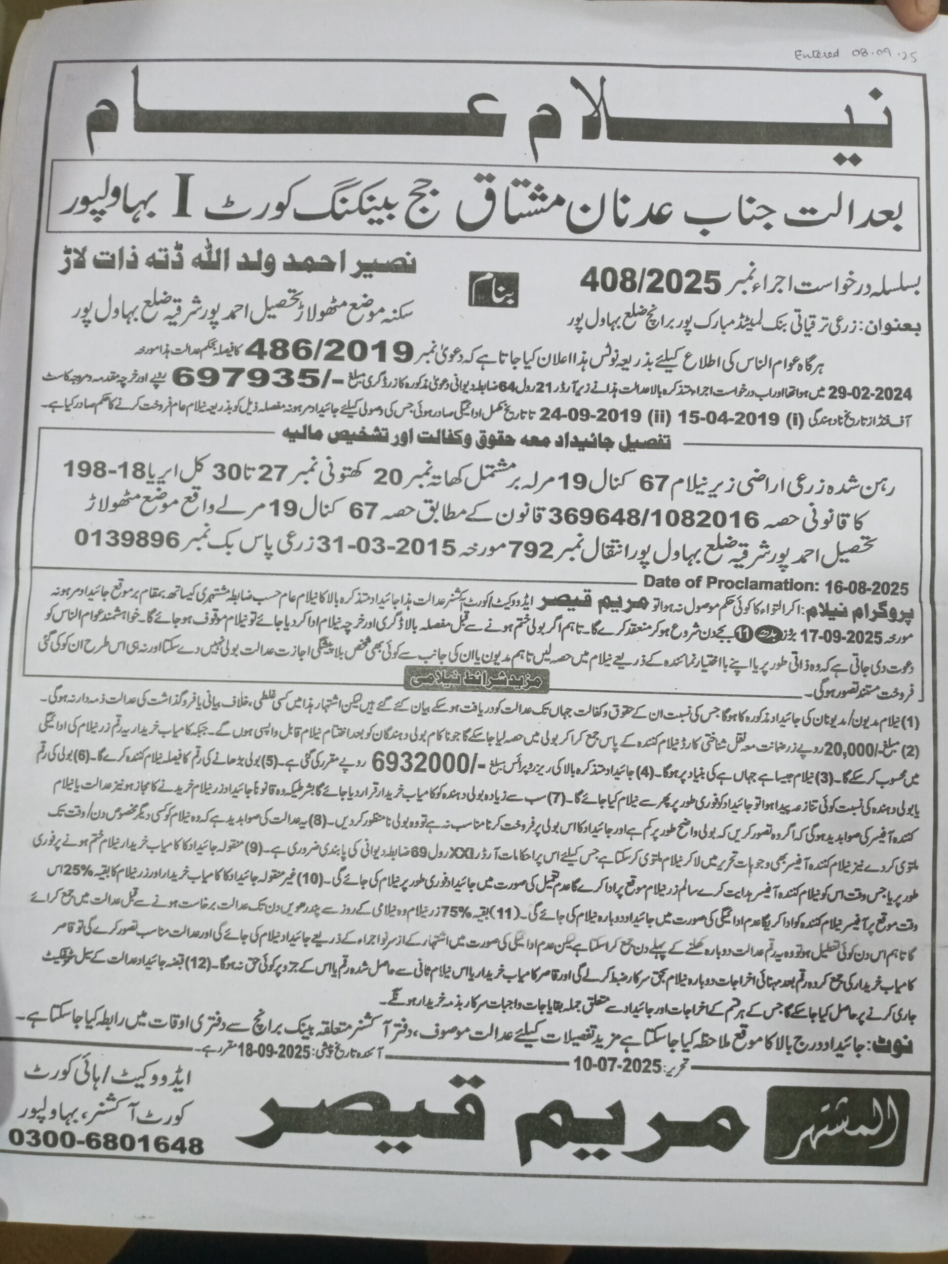 12. ZTBL مبارک پور برانچ بمقابلہ نصیر احمد ولد اللہ دتہ، پھانسی نمبر 408/2025 [17-ستمبر-2025، بدھ صبح 11.00 بجے]